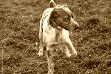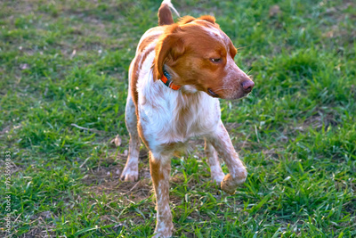 Serious cute red spaniel walking on green grass
