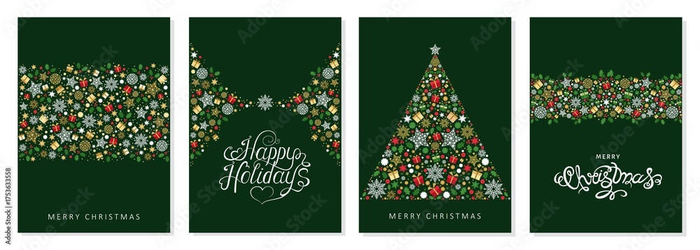 Stylish Christmas card collection with seasonal ornaments, stars, Xmas tree and holly for winter celebrations. Happy holidays.