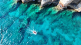 Aerial drone photo of scenic paradise complex of blue caves in Northern part of Zakinthos island a tourist attraction visited by small boats and cruises, Ionian, Greece