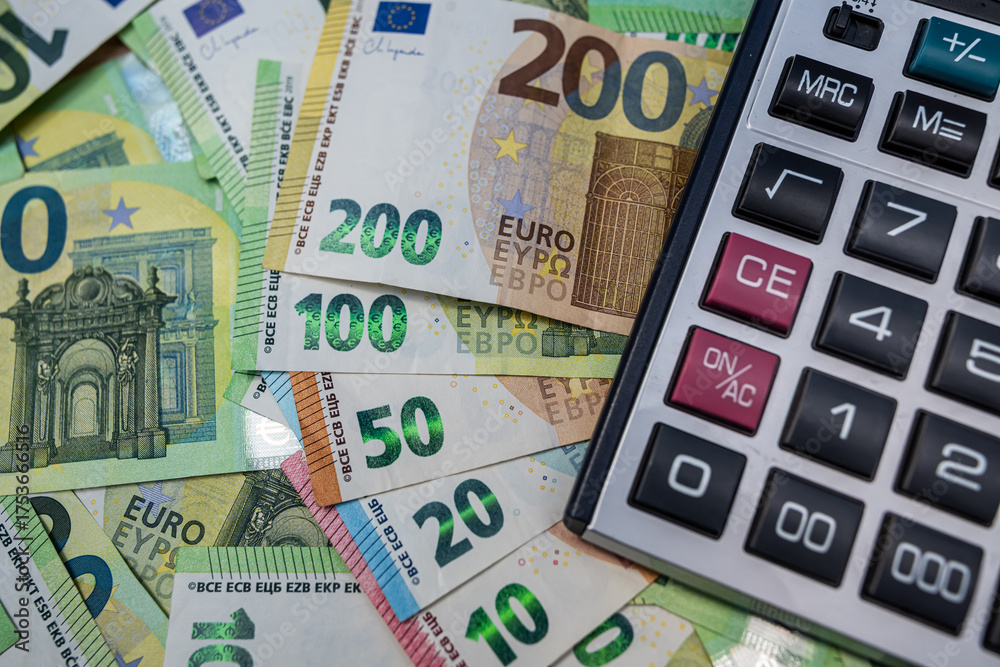 Euro banknotes with calculator, financial accounting, investment planning and business budget concept