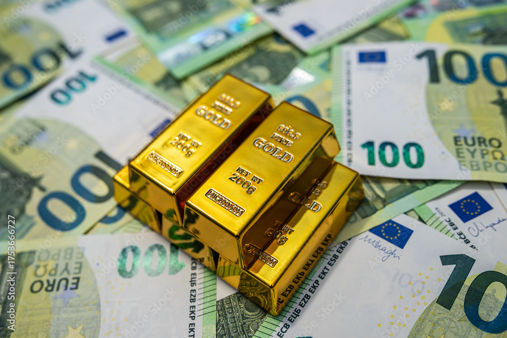 Euro banknotes with gold bars, investment, financial growth, fortune and wealth concept