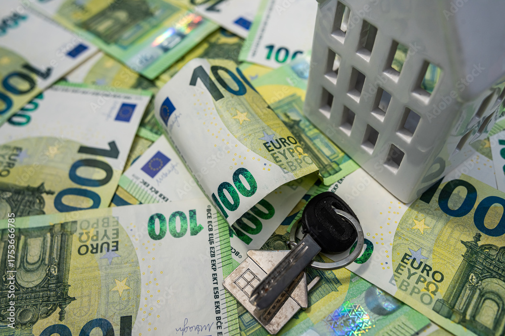 House model and keys on euro banknotes, real estate investment, mortgage and property finance concept