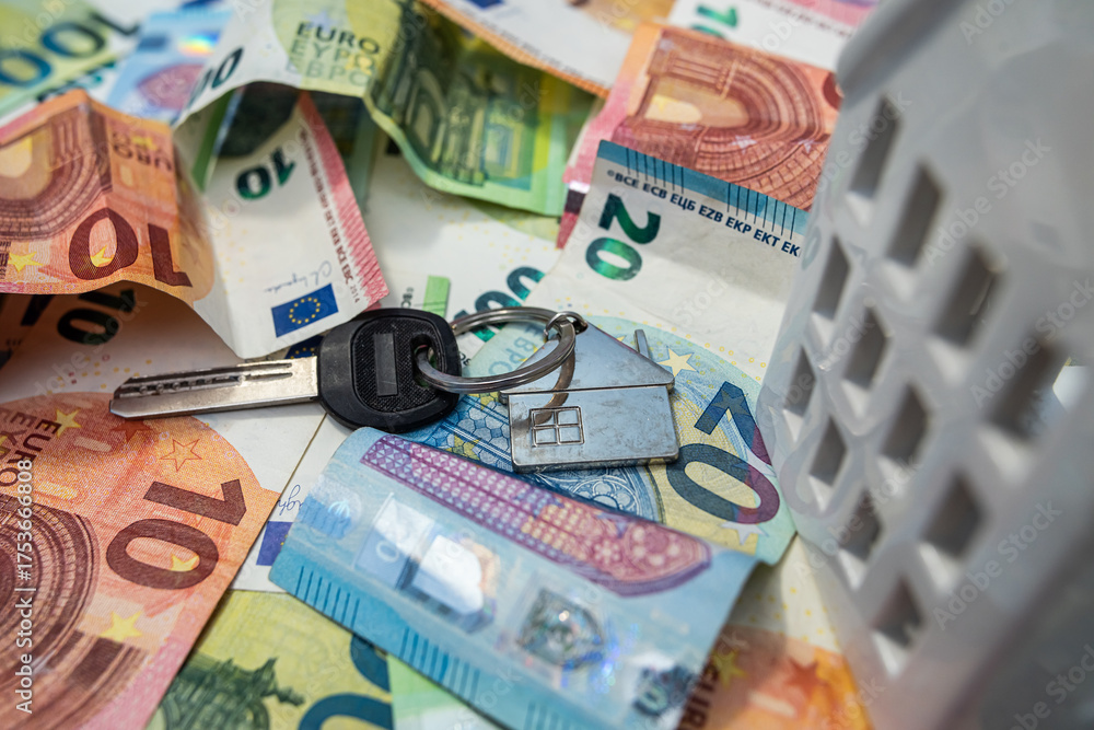Euro bills with keychain house representing real estate savings, wealth and home ownership success.