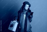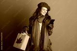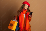 A smiling woman in red beret and orange scarf holds shopping bags while looking at her smartphone. Her stylish brown coat and gloves evoke cheerful, modern autumnal mood, perfect for seasonal shopping