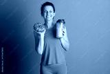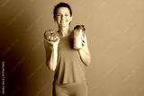 A smiling woman with closed eyes in orange activewear holds a pumpkin and a protein shaker, conveying a cheerful, healthy, autumn-themed mood.