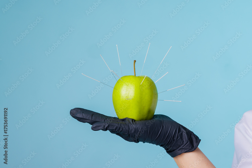 Green apple with acupuncture needles in gloved hand for dry needling training concept