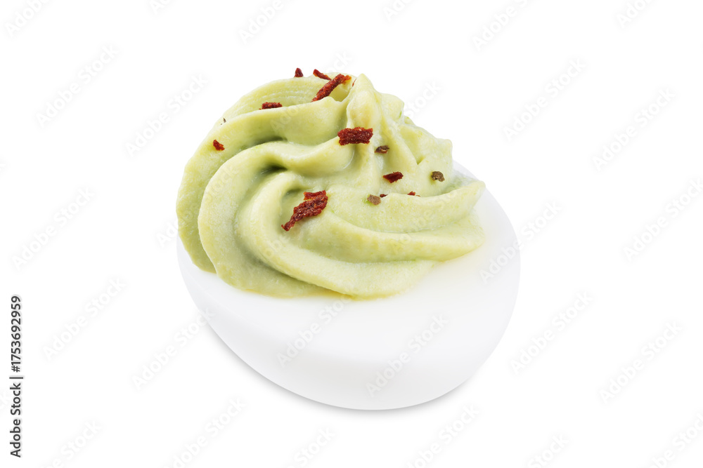 Avocado cream deviled eggs for Christmas holidays on a white isolated background