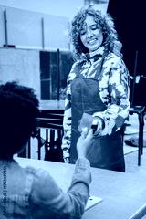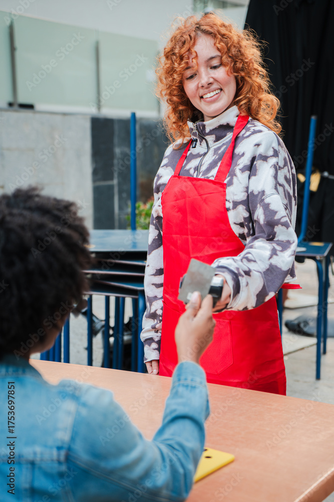 Friendly woman engages with customer during payment process, showcasing excellent service skills and a positive attitude while handling transaction with a credit card and ensuring satisfaction.