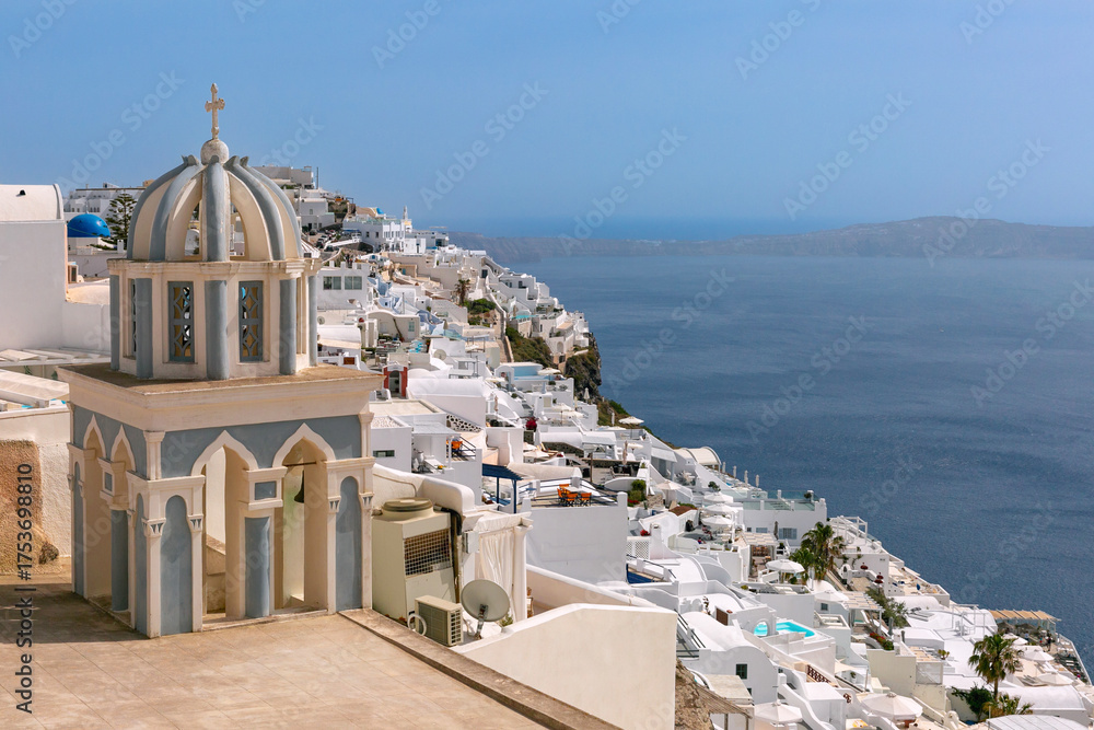 Coastal view of the church bell tower and white buildings in Imerovigli on Santorini island in Greece