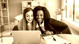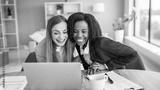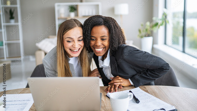 Diverse businesswomen laughing enjoying teamwork on laptop in office