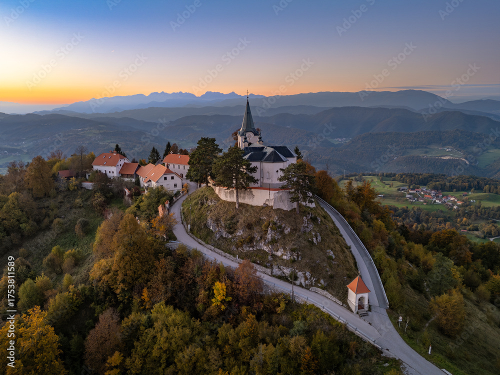 Aerial view of the Pilgrimage Church of the Birth of Mary and its defensive wall atop the 852m high Holy Mountain of Zasavje at sunset, surrounded by autumnal forests.
