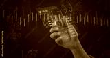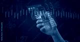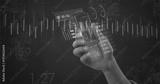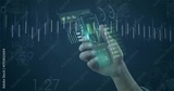 Gripping smartphone projecting translucent holographic panels in AR workspace, data visualization