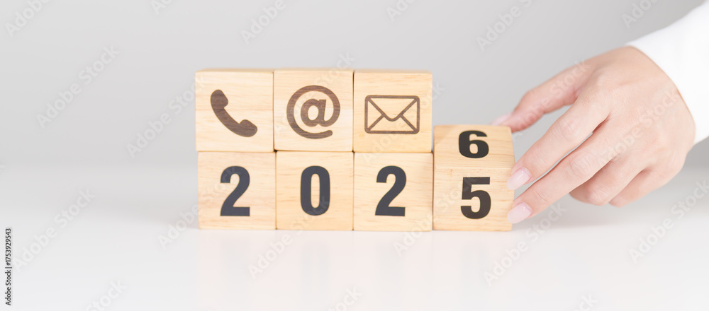 Happy New Year 2026 block for Contact Us concepts. Wood block of Email, call Phone and Website Address sign. For Customer support hotline, business Marketing, Corporate, communication and Advertising