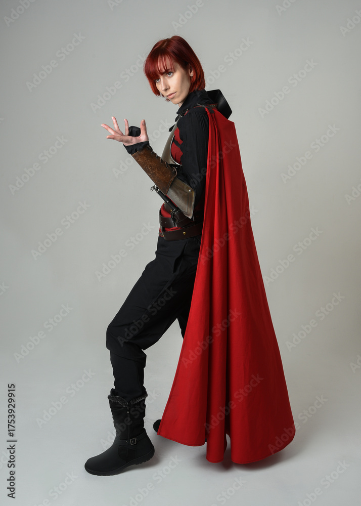full length fantasy portrait of warrior woman knight, model wearing historical medieval steel armour costume, red fairytale cloak. standing walking pose, isolated studio background.