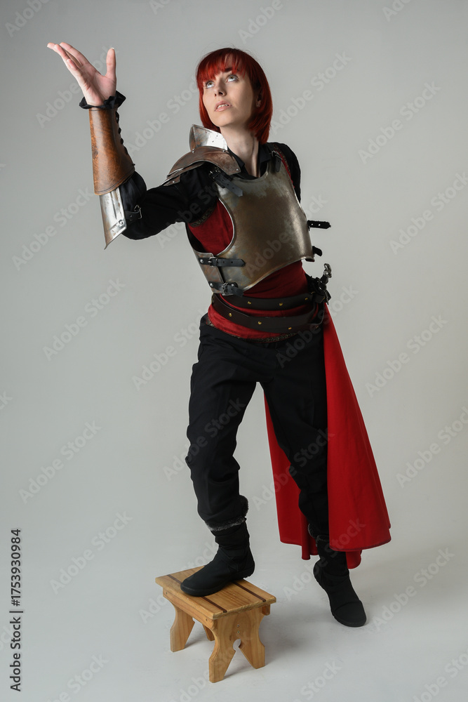 full length fantasy portrait of warrior woman knight, model wearing historical medieval steel armour costume, red fairytale cloak. standing walking pose, isolated studio background.