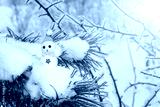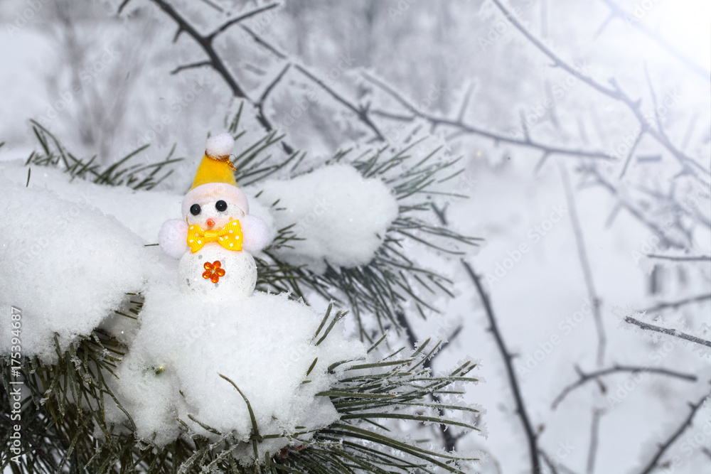 The snowman is on a branch of spruce. Snow flakes lie on the branches before the New Year.