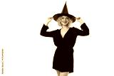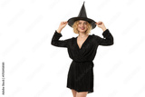 Woman smiles while wearing a witch costume and hat, isolated, PNG