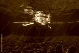 Happy family - mother, baby girl in goggles swim, dive in pool with fun - jump deep down underwater. Healthy lifestyle, people water sport activity, swimming lessons on holidays with kids