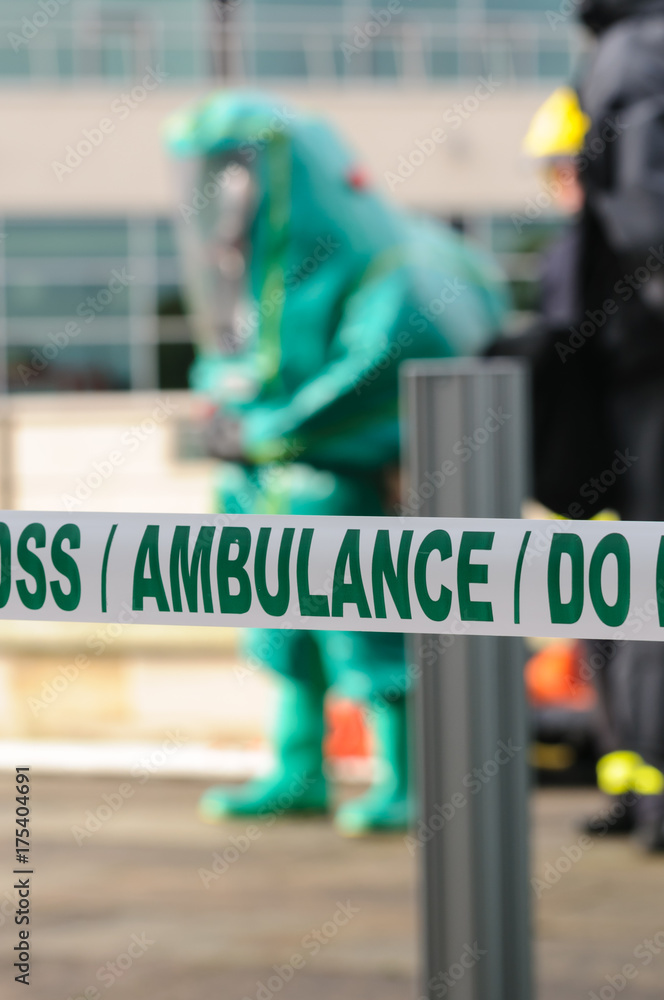 Paramedic wearing Gas Tight Suit (GTS) during a training exercise against biological, chemical or radioactive incidents
