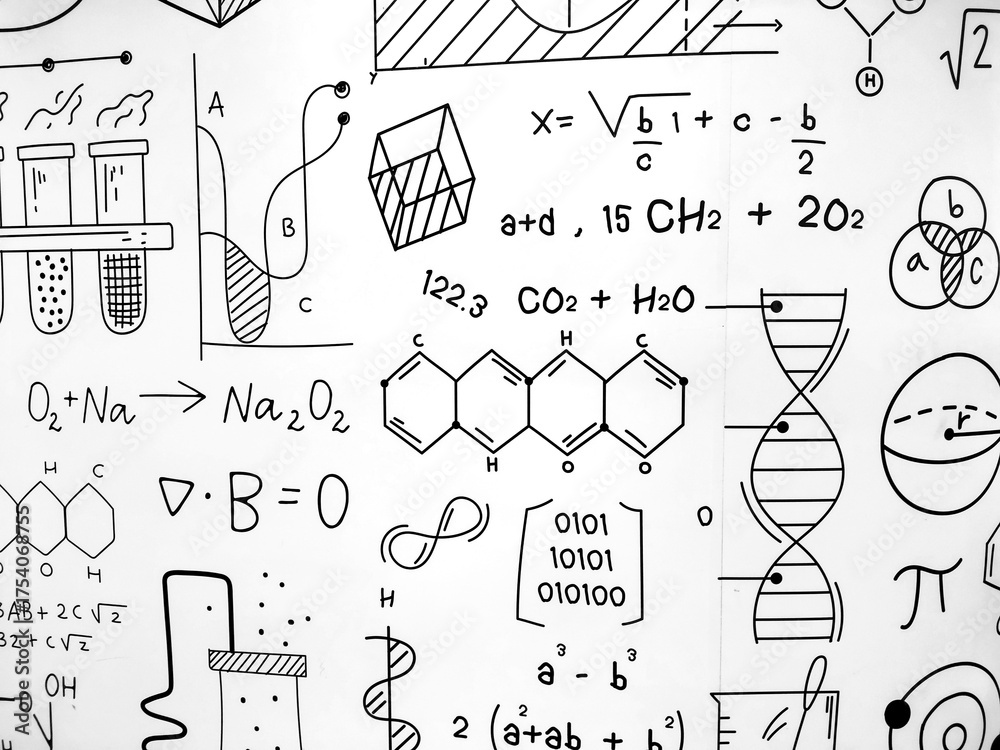 The whiteboard contains various mathematical formulas, scientific diagrams and equations hand-drawn with black marker. Education concept