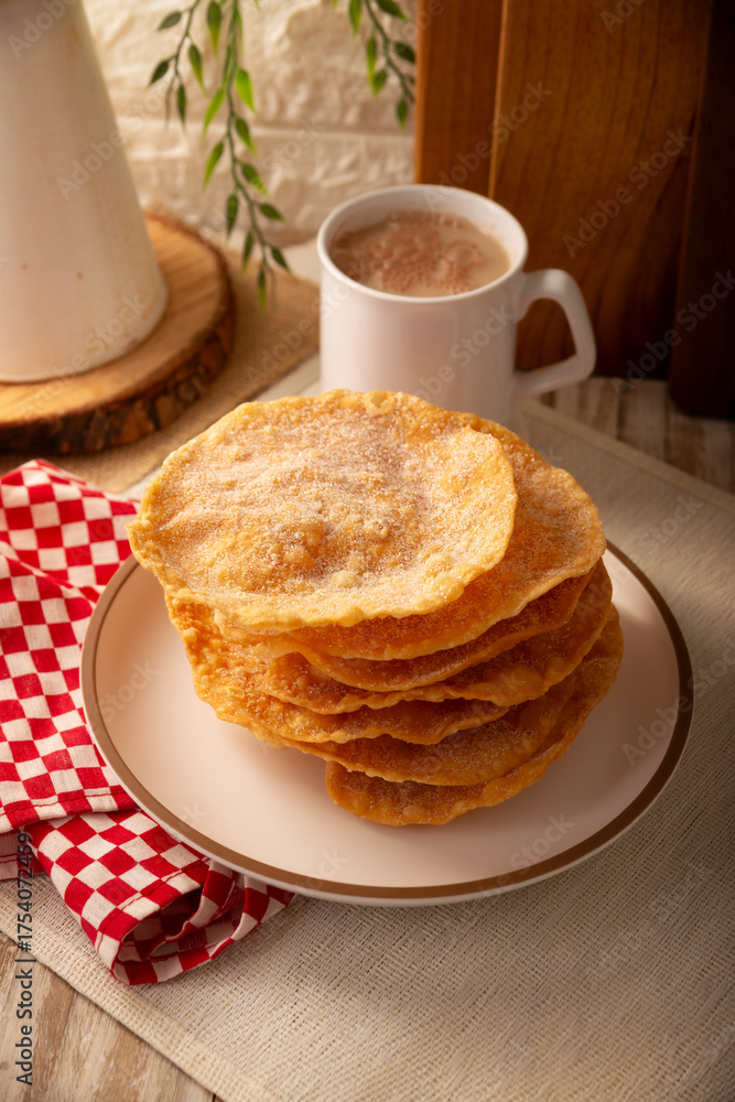 Mexican Buñuelos. Traditional food at Christmas and winter holidays in Mexico, these are fried flour tortillas sprinkled with sugar or covered in a syrup made with piloncillo, cinnamon, and guava.