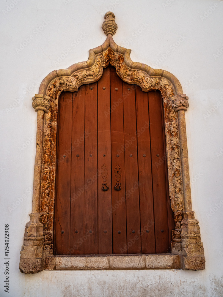 Famous window at the Church of mercy, built in the mid-16th century in Silves, Algarve in Portugal