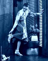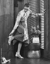 Stylish woman in floral blouse and pleated skirt with flowers and accessories indoors.