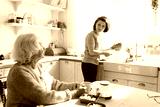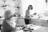 Caring mature female caregiver helping her senior patient to cook, standing next to counter holding pumpkin, going to bake pie while talking to elderly woman sitting at kitchen table