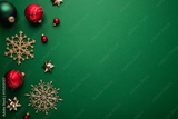 Merry Christmas and Happy Holidays greeting card, frame, banner. New Year. Noel. Red, golden Christmas ornaments on green background top view. Winter xmas holiday festive theme. Flat lay