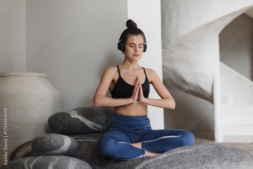 Young woman sits cross-legged in lotus pose on large cushions, wearing big headphones and meditating. Cozy boho-style interior with clay-like staircase in the background. Concept of mindfulness