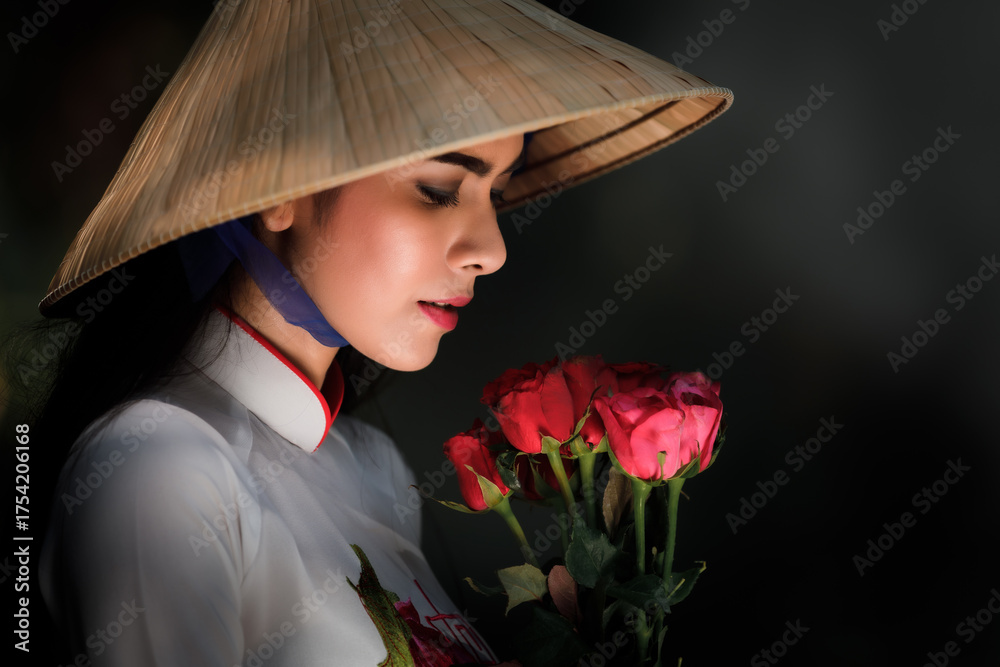 woman in a Vietnamese traditional dress, Áo dài, is gently looking down at red roses in her hands. The photo beautifully captures her natural grace and soft, feminine charm.