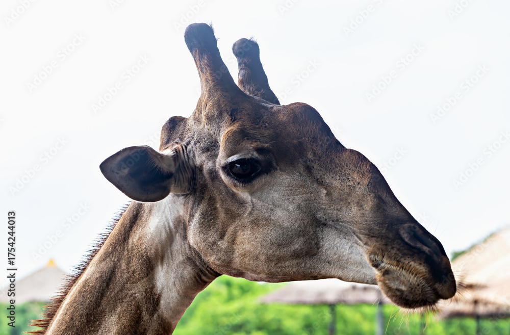 Safari. Giraffe. Majestic giraffe with distinctive ossicones is captured in serene safari setting, surrounded by lush greenery and soft natural light, emphasizing its elegant stature and grace