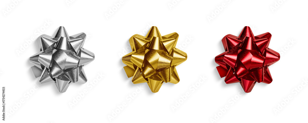 Shiny red, gold and silver metallic gift bow isolated on a transparent background, PNG. High resolution. Festive ribbon decoration for wrapping presents, Christmas, birthdays, and holiday celebration.