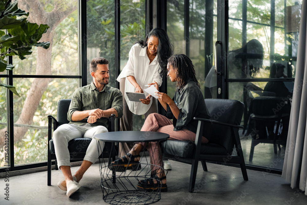 Multicultural professional businesspeople working together on research plan in boardroom.