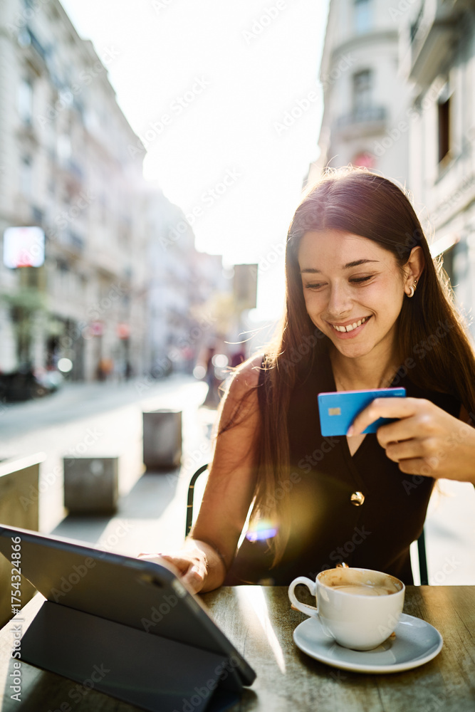 Portrait of a smiling young woman girl with a coffee cup in a coffee shop or a restaurant in the city, shopping online using a credit card and tablet online, or entrepreneur businesswoman working