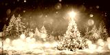 Christmas Tree On Snow In Night Forest With Shiny Star And Gift Boxes In Winter Landscape And Abstract Bokeh Lights