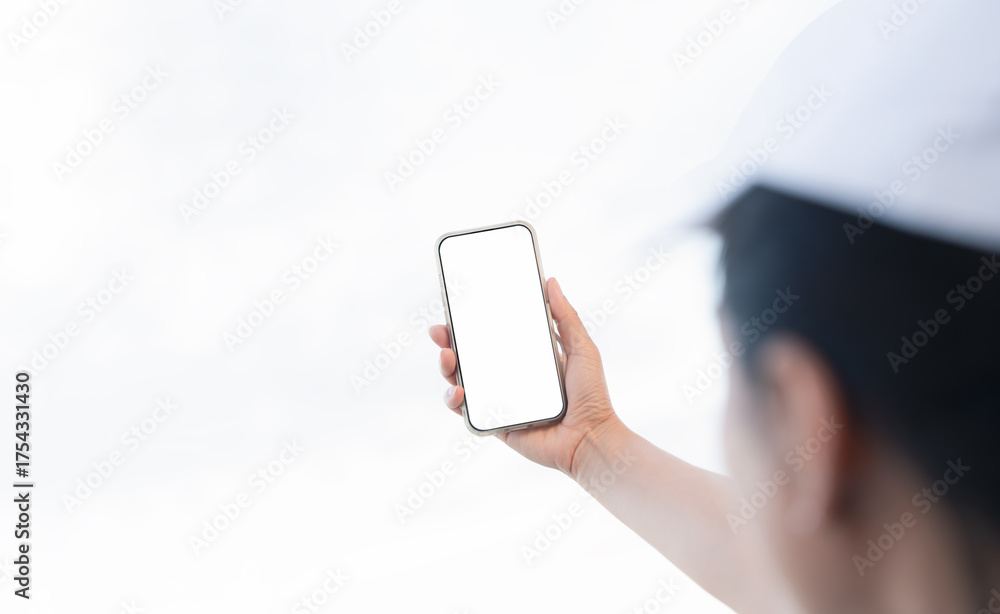Person holding smartphone with blank screen on white background,Image ideal for mobile app mockup, UI,UX design presentation, digital lifestyle content, and technology marketing visuals