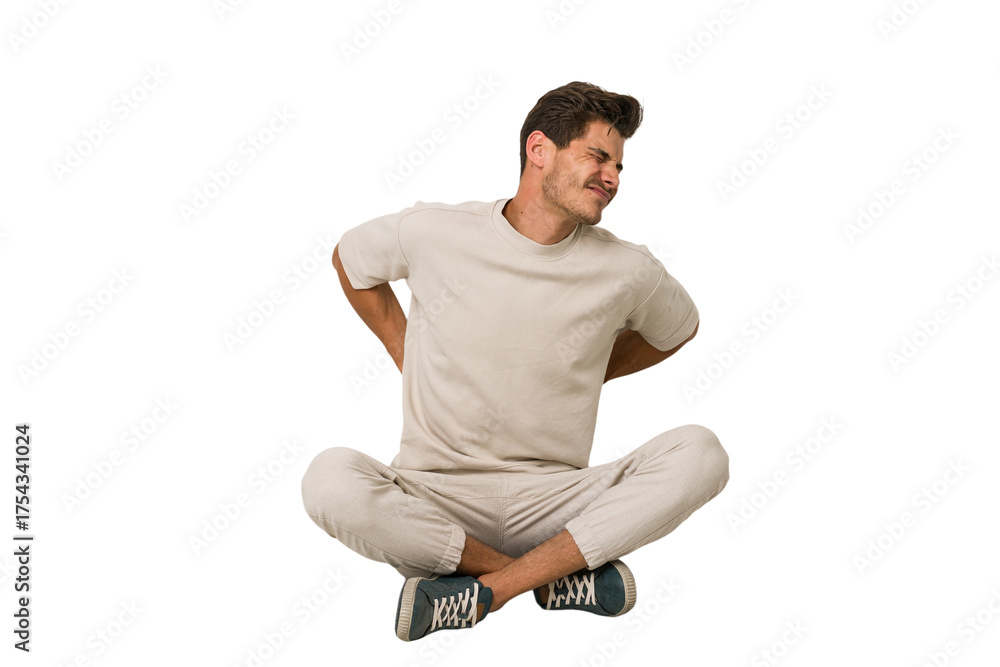 Young caucasian man sitting on the floor isolated on white background suffering a back pain.