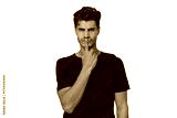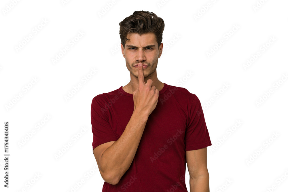 Young handsome caucasian man isolated on white background thinking and looking up, being reflective, contemplating, having a fantasy.