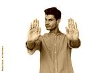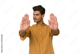 Young handsome caucasian man isolated on white background standing with outstretched hand showing stop sign, preventing you.