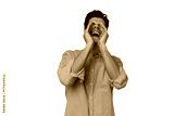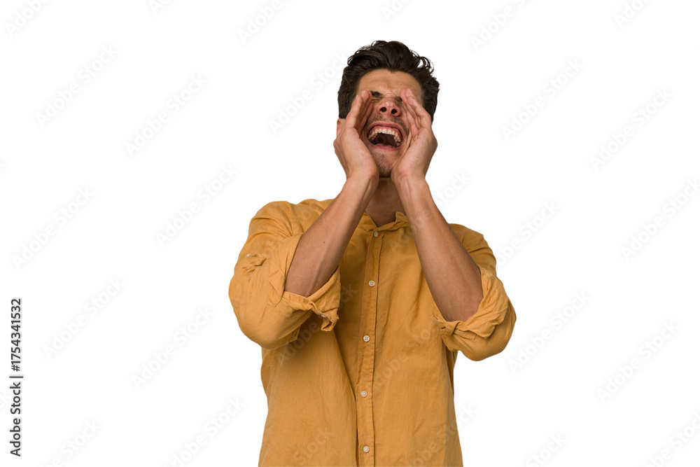 Young handsome caucasian man isolated on white background shouting excited to front.