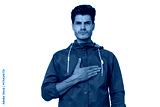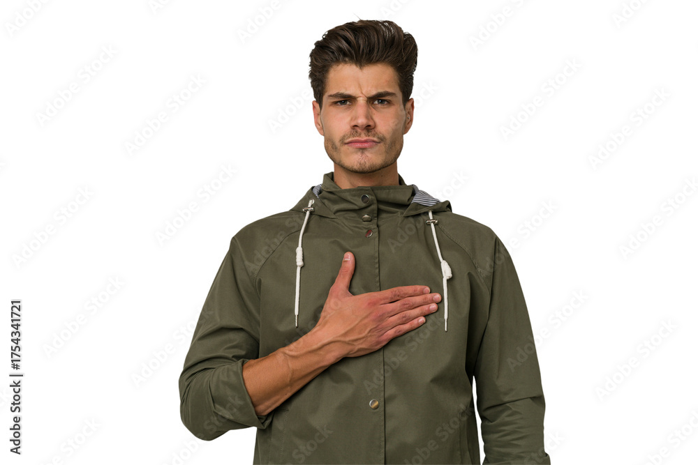 Young handsome caucasian man isolated on white background taking an oath, putting hand on chest.