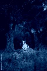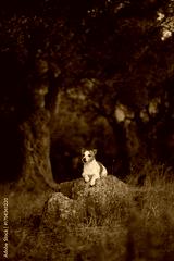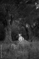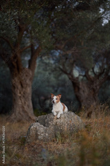 A Jack Russell Terrier sits on a large stone surrounded by olive trees. The composition creates a sense of stillness and solitude in a shaded natural setting.