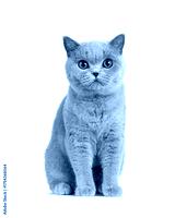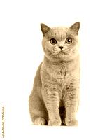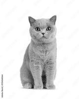 Beautiful British Shorthair cat sitting up facing front. Looking straight to camera. Isolated on a white background