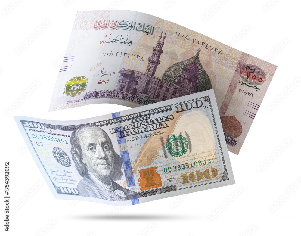 Egyptian 200LE Banknotes and 100$ Flying on a White Background, Currency Exchange Concept, All in Focus