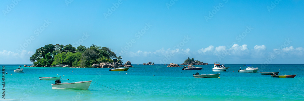 Boats at Anse Lazio panorama, scenic beach in Praslin island, Seychelles web banner