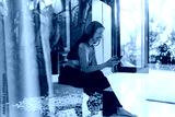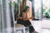 Laughing woman with smartphone sits barefoot in modern room—capturing authentic emotion, casual tech use, and playful spirit of remote freedom.