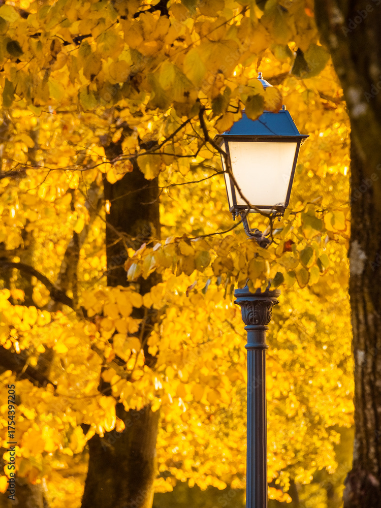 Autumn and foliage in the park. Vintage street lamps among yellow autumnal leaves