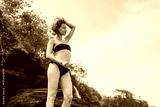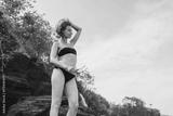 Curly-haired woman with intense gaze removes sunglasses, evoking personal transformation, renewal and power of presence under sky in tropical coastal backdrop.