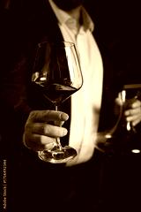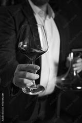Sommelier offering glass of red wine with calm confidence. Concept of hospitality, mindfulness, and refined communication in luxury service with emotional warmth.
